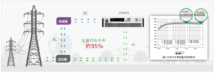 IT8000系列能量回饋式直流電子負(fù)載不同于能量消耗型的普通電子負(fù)載,其主要的特點(diǎn)是提供能量回收功能,可以回收電能然后廠內(nèi)直接利用,而非以熱能的形式消耗掉。其轉(zhuǎn)換效率可約95%,不但大大降低了用戶的用電成本,同時(shí)也避免使用空調(diào)或昂貴的制冷系統(tǒng),減少噪音。